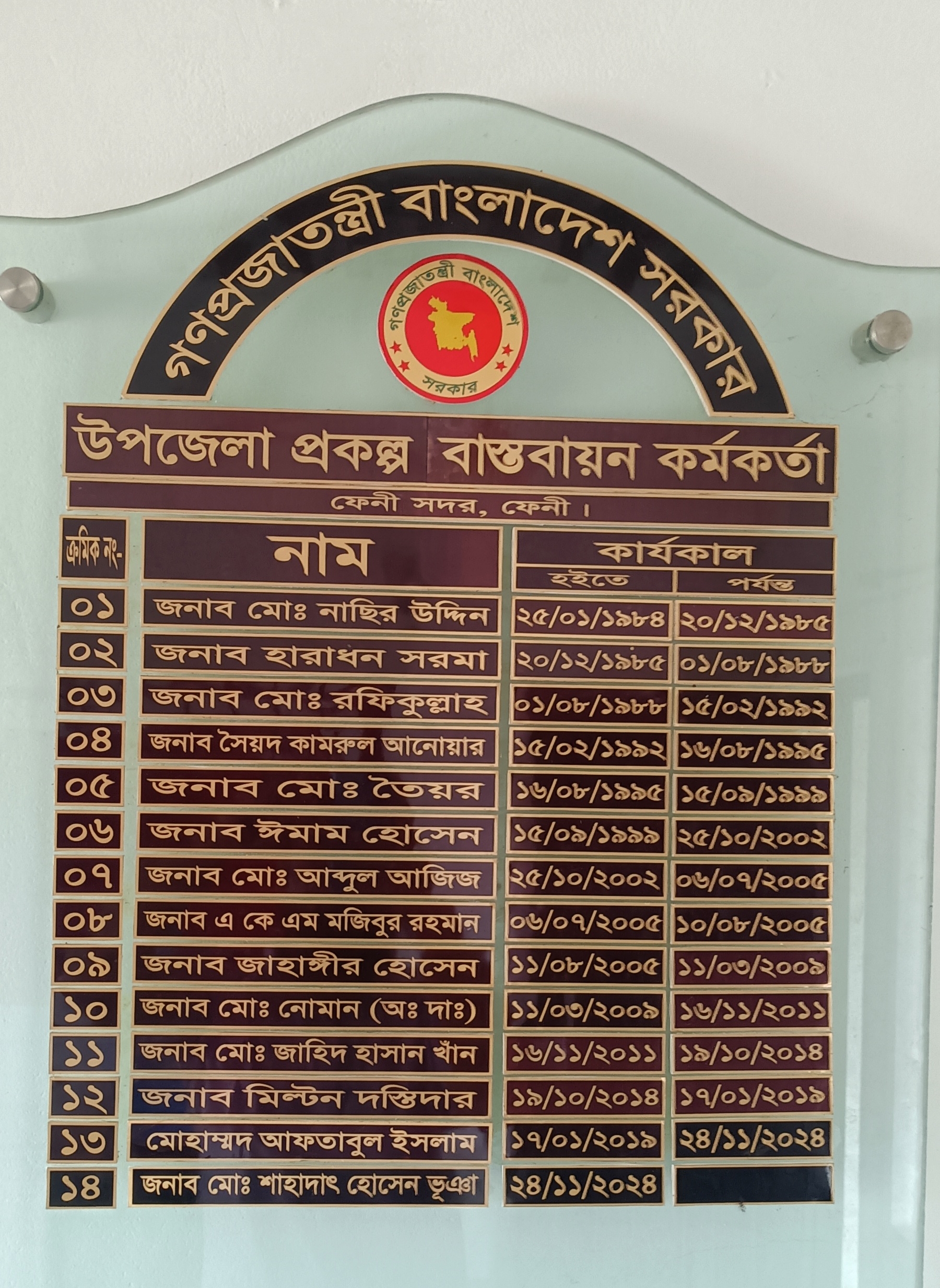 | ০১ | জনাব মোঃ নাছির উদ্দিন | ২৫/০১/১৯৮৪ | ২০/১২/১৯৮৫ |